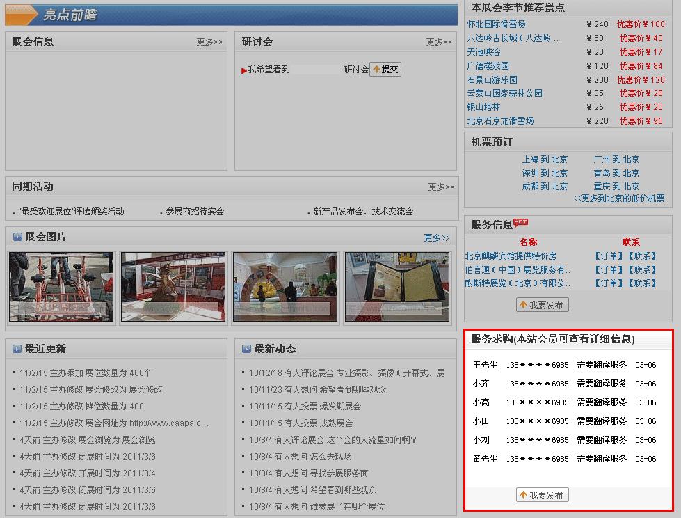 如果觀眾或展商需要搭建、運(yùn)輸?shù)确?wù),他們可以發(fā)布服務(wù)需求,并在展覽會的右下部顯示出來,如下圖所示: